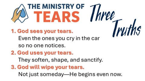 Revelation 7:17 NIV 17 For the Lamb at the center of the throne will be their shepherd; ‘he will lead them to springs of living water.’ ‘And God will wipe away every tear from their eyes.’”SLIDE: TitleINTRODUCTIONThere are two kinds of people in the world:1. Those who cry.2. And those who lie about not crying.We cry at weddings, funerals, Hallmark movies, and—if you’re like me—when you open the electric and natural gas bills for January.Tears are universal. They’re the one language every human being speaks fluently. And Revelation 7:17 gives us this breathtaking promise: God Himself will wipe away every tear. Not just stop them. Not just explain them. But wipe them. Tenderly. Personally. Eternally.Today I want to talk about “The Ministry of Tears.” Because tears are not just something we endure. They are something God uses.Main TeachingSLIDE:1. TEARS ARE A TESTIMONYWe often think tears mean weakness. But in Scripture, tears are often a sign of faith, love, and longing.We see these examples in the Bible:Hannah wept in the temple until God opened her womb. 1 Samuel 1:5-28David said, “My tears have been my food day and night.” Psalm 42:3Jeremiah was called the weeping prophet. Lamentations 2:11Jesus, Himself wept at Lazarus’ tomb. John 11:35If Jesus cried, then tears cannot be a sign of spiritual failure.IllustrationA little boy once asked his mom, “Why do people cry?” She said, “Because sometimes our hearts have too many words and not enough room.”That’s good theology.Tears testify that we are human, that we care, that something matters deeply.ApplicationInstead of hiding your tears, let them speak. Let them say: - “This hurts.” - “This matters.” - “I’m not done trusting God.”Your tears are not a contradiction to your faith. They are often the evidence of it.SLIDE:2. TEARS ARE A TOOLGod doesn’t waste tears. Psalm 56:8 says He collects them in a bottle. Not one falls unnoticed.Tears Soften the SoilThink of tears like rain on hard ground. When the soil of our heart gets dry, cracked, and stubborn, tears soften our hearts so God can plant something new.IllustrationA farmer once said, “The best crops grow in the fields that have known the most storms.” The same is true of people.JokeSome of us say, “I don’t cry.” But let someone scratch your car in the church parking lot and suddenly you’re praying in tongues you didn’t know you had.ApplicationAsk God: - “What are You softening in me?” - “What are You planting through this season?” - “What are You preparing me to receive?”Your tears may be watering the very miracle you’ve been praying for.SLIDE:3. TEARS ARE TEMPORARYRevelation 7:17 is not a metaphor. It is a promise.“God will wipe away every tear from their eyes.”Not some. Not most. Every. — Single. — One.God has a Personal TouchGod doesn’t hand out tissues. He wipes the tears Himself.That means:He sees every sorrow.He understands every ache.He remembers every moment you thought you wouldn’t survive.IllustrationImagine a parent wiping the tears of a child who fell off their bike. They don’t say, “Stop crying, you’re embarrassing me.” They kneel down, lift the chin, and say, “I’ve got you.”That’s the heart of God.ScripturePsalm 30:5 — “Weeping may endure for a night, but joy comes in the morning.”Morning always comes. Tears don’t get the last word. God does.SLIDE:4. TEARS ARE TRANSFORMEDIn Revelation 7, the tears are not just removed — they are redeemed.The people in this passage came through “great tribulation.” They didn’t escape suffering; they overcame it.God Doesn’t Just End Tears — He Rewrites Their MeaningTears of grief become testimonies of comfort.Tears of failure become stories of grace.Tears of fear become monuments of courage.Tears of repentance become rivers of renewal.IllustrationThink of a stained‑glass window. Up close, it looks like broken pieces. But when the light shines through, the brokenness becomes beauty.Your tears are the pieces God uses to make something glorious.SLIDE:5. TEARS POINT US TO THE SHEPHERDRevelation 7:17 says:“The Lamb will be their shepherd.”Only Jesus can be both Lamb and Shepherd. Only He can say:“I died for you.”“I lead you.”“I restore you.”“I wipe your tears.”ApplicationWhen tears come:- Run to the Shepherd. - Let Him lead you to “springs of living water.” - Let Him restore your soul. - Let Him hold what you cannot.Your tears are not a detour. They are a doorway into deeper fellowship with Christ.SLIDE: Three TruthsCONCLUSION: THE MINISTRY OF TEARSLet me leave you with three truths to carry home:1. God sees your tears. Even the ones you cry in the car so no one notices.2. God uses your tears. They soften, shape, and sanctify.3. God will wipe your tears. Not just someday — He begins even now.Final IllustrationA pastor once said, “When we get to heaven, the first thing God will do is wipe our tears. The second thing He’ll do is show us why we cried.”And I tell you:In that moment: - Every tear will make sense. - Every sorrow will bow to joy. - Every ache will be healed. - Every wound will be whole.Why? Because the Lamb is our Shepherd. And He leads us home.SLIDE: PrayerClosing PrayerFather, we come to You as people who know what it is to weep. Some of our tears have been loud, some silent, some recent, some buried deep. But today we thank You that not one of them has ever fallen unnoticed. You are the God who sees. You are the God who stays close. You are the God who bends down to wipe our eyes.Lord Jesus, Shepherd of our souls, lead us to those springs of living water. Where our hearts have grown dry, soften us. Where our spirits feel cracked and weary, restore us. Where grief has settled like a heavy fog, shine Your light through it. Teach us to trust You in the tears, not just after they’re gone.Holy Spirit, comfort every hurting place in this room. For the tears cried in hospital rooms, 