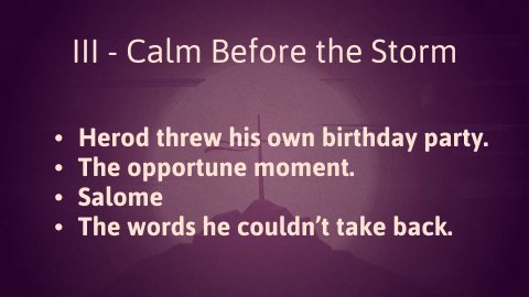 Psalm 1 CSB 1 How happy is the one who does not walk in the advice of the wicked or stand in the pathway with sinners or sit in the company of mockers! 2 Instead, his delight is in the Lord’s instruction, and he meditates on it day and night. 3 He is like a tree planted beside flowing streams that bears its fruit in its season, and its leaf does not wither. Whatever he does prospers. 4 The wicked are not like this; instead, they are like chaff that the wind blows away. 5 Therefore the wicked will not stand up in the judgment, nor sinners in the assembly of the righteous. 6 For the Lord watches over the way of the righteous, but the way of the wicked leads to ruin.Psalm 1 gives us a lens for understanding what’s about to unfold: John, though in chains, is like the tree planted by streams of water—his life rooted in righteousness, bearing fruit that will outlast him. Herod and Herodias, on the other hand, are the chaff—powerful in the palace, but fruitless in the end.And here’s the remarkable thing: John’s life, his message, and even his death shape how people—including Herod—begin to wrestle with Jesus's identity. The fruit of his faithful witness remains, even when his voice is silenced. So the question for us becomes: What kind of life leads others to rightly see Jesus?PassageMark 6:14–29 CSB 14 King Herod heard about it, because Jesus’s name had become well known. Some said, “John the Baptist has been raised from the dead, and that’s why miraculous powers are at work in him.” 15 But others said, “He’s Elijah.” Still others said, “He’s a prophet, like one of the prophets from long ago.” 16 When Herod heard of it, he said, “John, the one I beheaded, has been raised!” 17 For Herod himself had given orders to arrest John and to chain him in prison on account of Herodias, his brother Philip’s wife, because he had married her. 18 John had been telling Herod, “It is not lawful for you to have your brother’s wife.” 19 So Herodias held a grudge against him and wanted to kill him. But she could not, 20 because Herod feared John and protected him, knowing he was a righteous and holy man. When Herod heard him he would be very perplexed, and yet he liked to listen to him. 21 An opportune time came on his birthday, when Herod gave a banquet for his nobles, military commanders, and the leading men of Galilee. 22 When Herodias’s own daughter came in and danced, she pleased Herod and his guests. The king said to the girl, “Ask me whatever you want, and I’ll give it to you.” 23 He promised her with an oath: “Whatever you ask me I will give you, up to half my kingdom.” 24 She went out and said to her mother, “What should I ask for?” “John the Baptist’s head,” she said. 25 At once she hurried to the king and said, “I want you to give me John the Baptist’s head on a platter immediately.” 26 Although the king was deeply distressed, because of his oaths and the guests he did not want to refuse her. 27 The king immediately sent for an executioner and commanded him to bring John’s head. So he went and beheaded him in prison, 28 brought his head on a platter, and gave it to the girl. Then the girl gave it to her mother. 29 When John’s disciples heard about it, they came and removed his corpse and placed it in a tomb.I - Character CastJohn the Baptist - The miracle child sent by God as a messenger who paved the way for the Messiah. He preached repentance in the wilderness and pointed everyone to Jesus, whom he baptized. He had a large group of disciples who remained faithful to him, even after he was imprisoned by Herod Antipas.Herod - His name was Antipas, and he was the son of Herod the Great. Herod is a dynastic name, not a personal name. He had two brothers and one sister. When Herod the Great died, his will divided his kingdom into 4, and his children were named rulers over each region. That is why he is called a Tetrarch. Though he wanted to be called a king, he would never truly be one. He was known as a builder and ruled in Galilee and Perea for 43 years. He married the daughter of Aretas, King of Arabia… a marriage that forged an alliance.Herodias - the daughter of one of the four sons, Aristobulus. She then married her uncle, Philip. During a trip to Rome, Herod Antipas visited his brother and fell in love with his wife. He eventually wooed and persuaded her to leave Philip and marry him. He then divorced his wife and married his sister-in-law/niece.Salome- Herodia’s daughter from her marriage to Philip. She is not named in Scripture, but by the Jewish historian Josephus. Nothing else is known about her apart from this story. The word ‘girl’ used to describe her is the same word used to describe Jairus’ 12-year-old daughter. If you put that beside the other description that she was of marital age, then she is likely in her mid to late teenage years.II - ConflictThe issue. John called their marriage sinful. They broke many Old Testament laws. They both unlawfully divorced their spouses. They lusted. Herod took his brother’s wife, which is forbidden by Levitical law. Nothing about this union was good or righteous, and John was not afraid to call them out on it. He was bold and zealous for the God he serves. No doubt, he called them to reject sin and repent, just as he had been saying to everyone else. Evidently, John had gained enough of a reputation as a prophet and righteous man to give Herod pause. So, instead of killing him, he put John in prison… as it would seem to be punishment, but also as a means to shield him from Herodias’ murderous desires.The marriage. Despite John’s rejection of their sinful union, Herod liked John. To him, John was a fascinating enigma. He protected him so he could go and listen to him. He was vexed by him, but feared him because he saw John as a holy man (something even the Pharisees were forced to recognize during a clash with Jesus). On the other hand, Herodias recognized