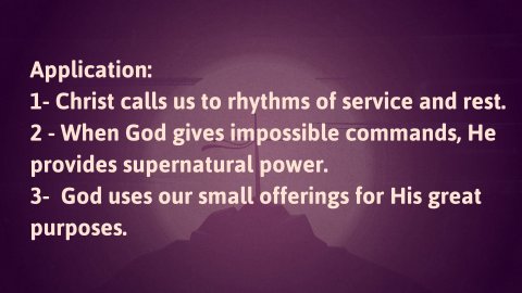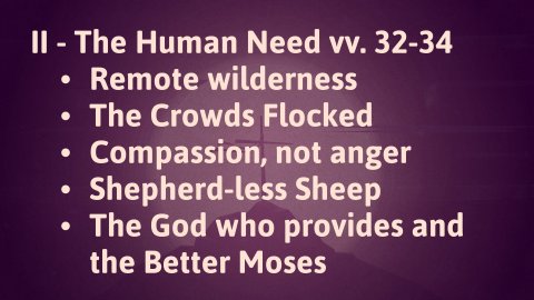Mark 6:30–44 CSB 30 The apostles gathered around Jesus and reported to him all that they had done and taught. 31 He said to them, “Come away by yourselves to a remote place and rest for a while.” For many people were coming and going, and they did not even have time to eat. 32 So they went away in the boat by themselves to a remote place, 33 but many saw them leaving and recognized them, and they ran on foot from all the towns and arrived ahead of them. 34 When he went ashore, he saw a large crowd and had compassion on them, because they were like sheep without a shepherd. Then he began to teach them many things. 35 When it grew late, his disciples approached him and said, “This place is deserted, and it is already late. 36 Send them away so that they can go into the surrounding countryside and villages to buy themselves something to eat.” 37 “You give them something to eat,” he responded. They said to him, “Should we go and buy two hundred denarii worth of bread and give them something to eat?” 38 He asked them, “How many loaves do you have? Go and see.” When they found out they said, “Five, and two fish.” 39 Then he instructed them to have all the people sit down in groups on the green grass. 40 So they sat down in groups of hundreds and fifties. 41 He took the five loaves and the two fish, and looking up to heaven, he blessed and broke the loaves. He kept giving them to his disciples to set before the people. He also divided the two fish among them all. 42 Everyone ate and was satisfied. 43 They picked up twelve baskets full of pieces of bread and fish. 44 Now those who had eaten the loaves were five thousand men.I - Rest vv.30-31Mission report - After a brief pause in the narrative of Jesus and His disciples, Mark now returns to it. The disciples return from their first missionary journey, breathless with excitement. Sent out two by two with nothing but staff and sandals, they now gather around Jesus like children reporting to their father. "Look what God did through us! You should have seen the demons flee! The sick were healed!" This wasn't merely a debriefing—it was a celebration of God's faithfulness.Consolidated crowds - However, they were not alone. Evidently, their witness and deeds were so impressive that crowds from all around had followed them back to their huddle. The crowds were amassing so quickly that the poor men didn’t even have time to eat!The command to rest - Later, Mark describes Jesus's compassion for the crowds, but right now we see His compassion for His disciples. Seeing the crowd, Jesus took the men to a remote place and commanded them to rest. Jesus, the one who had ordained the Sabbath rhythm at creation, now models pastoral care for His under-shepherds. This was a mercy. The disciples had just finished a regional tour, traveling in complete trust, taking only essentials and relying on the generosity of the townspeople for food and shelter. That had to have been an exhausting experience, and Jesus knows because He has been there Himself.Here's the profound truth: The same Christ who commands us to "go and make disciples" also commands us to "come and rest for a while." Both imperatives flow from His sovereign love. He knows that fruitful ministry requires not just passionate hearts, but restored souls. Don’t conflate exhaustion with effectiveness.II - The Human Need vv. 32-34Remote wilderness - Jesus brought His disciples to a remote place. The word used here describes a desolate wilderness. As we have seen before, Scripture often portrays the wilderness as a testing ground where God reveals both human weakness and divine sufficiency, and this is no exception. The disciples are about to face an exam they never saw coming.The crowds flocked – But their retreat was short-lived. Mark tells us that Jesus and the disciples got into a boat to go to a remote place. As Jesus and the Twelve sailed across the water, something remarkable happened: since the growing crowd could not get in boats, the crowds from every surrounding town began running along the shoreline. Matthew tells us there were 5,000 men "besides women and children"… so this could have been upwards of 15,000 people or more, all sprinting to reach Jesus first. Picture it: a massive human stampede following Jesus and the disciples in a desperate pursuit for more.Compassion, not anger - During their mission report, the crowd wouldn’t even let them eat, and now they sprinted ahead of them so that the mass of people would be there when the boat landed. I think any of us would be annoyed at best by the relentless pursuit. These men were tired, drained, and hungry. When Jesus stepped ashore and saw this massive crowd, what was His response? Frustration at His interrupted rest? Annoyance at their presumption? No—He had compassion on them. The Greek word here describes a deep, gut-wrenching empathy that moves one to action. This is the heart of our Savior: never too tired to care, never too busy to shepherd. Jesus’ model and numerous scriptural verses encourage us not to grow weary of doing good.Shepherd-less sheep – Why such compassion? Because Jesus saw them as "sheep without a shepherd." Sheep are perhaps the most vulnerable creatures in God's creation—defenseless, directionless, and utterly dependent. These Jewish people had religious leaders, yes, but not true shepherds. The Pharisees were hirelings who cared more about their own power than their people's souls. The fact that they were going to such extreme lengths to remain with Jesus and His empowered delegation shows the depths of their need, and Jesus sees that. They may not even know what that need really is… they might come for the show of miracles, but Jesus understands how lost they are, and that is the entire reason He came… was to seek and save the lost.The God who provides and the Better Moses – But here stands the One prophesied in Ezekiel 34:11: "For this is what the Sovereign Lord says: 'I 