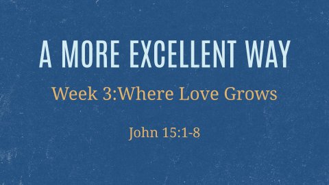 - Abide: Where Love GrowsText: John 15:1–17 Series: A More Excellent Way Big Idea: Love is not produced by effort—it is the fruit of abiding in Christ.INTRODUCTIONYou could introduce it something like this: “We’ve established that love isn’t something you produce through willpower or performance. But you might be wondering: How does this love actually flow through me? How do I access it? Jesus answers that question directly in John 15 with one of Scripture’s most powerful illustrations.Love is something we receive.Jesus answers this fundamental question—Where does this love come from?—by taking us to a vineyard. And in that vineyard, he reveals three essential truths about how divine love actually enters and flows through your life.”I. Jesus is the True Vine (vv. 1–3)Jesus begins: