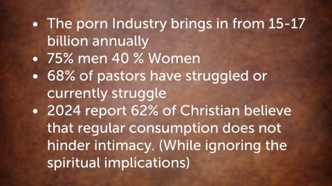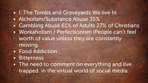Matthew 8:28–34 NKJV When He had come to the other side, to the country of the Gergesenes, there met Him two demon-possessed men, coming out of the tombs, exceedingly fierce, so that no one could pass that way. And suddenly they cried out, saying, “What have we to do with You, Jesus, You Son of God? Have You come here to torment us before the time?” Now a good way off from them there was a herd of many swine feeding. So the demons begged Him, saying, “If You cast us out, permit us to go away into the herd of swine.” And He said to them, “Go.” So when they had come out, they went into the herd of swine. And suddenly the whole herd of swine ran violently down the steep place into the sea, and perished in the water. Then those who kept them fled; and they went away into the city and told everything, including what had happened to the demon-possessed men. And behold, the whole city came out to meet Jesus. And when they saw Him, they begged Him to depart from their region.I. The Tombs and Graveyards We live InMatthew 8:28 NKJV When He had come to the other side, to the country of the Gergesenes, there met Him two demon-possessed men, coming out of the tombs, exceedingly fierce, so that no one could pass that way.The young men were in bondage. They were living among the DEAD THINGS. They were isolated and stuck in a location that was:Designed for deathInhabited by grief and depressionA home to the dark places (The Secret Bondages in our life)Alcholism/Substance Abuse 35%Gambling Abuse 61% of Adults 27% of ChristiansWorkaholism / Perfectionism (People can’t feel worth of value unless they are constantly movingFood AddictionBitternessThe need to comment on everything and live trapped in the virtual world of social media.Power principle: It is a concerning thing that in some sects of the body we of Christ, we no longer preach repentance and deliverance. We teach Management. Because some have lost faith in the ability of God to do miracles we operate in statements of doubt and unbelief. They learn to TOLERATE and CAPITULATE demonic activity in their lives.They no longer preach HEALING they preach SICKNESS Management!II. There are Spiritual Roots to many things we faceThis opens up a deep reality of Spiritual Warfare.Ephesians 6:12 NKJV For we do not wrestle against flesh and blood, but against principalities, against powers, against the rulers of the darkness of this age, against spiritual hosts of wickedness in the heavenly places.III. Refusing to combat the demonic will eventually leave people isolated so that the only option people have is to avoid them.The young men were so toxic and dangerous that they cause people to adjust their routes for safety.Some people have become some Toxic that avoidance is the only strategy some feel they have left. No one comes to help. They are left alone until their metaphorical grave becomes their geographical reality.IV. Convenient BondagePower Point: Some would rather see men in bondage and suffer the inconvenience of broken men than have their commerce disrupted.Matthew 8:33–34 NKJV Then those who kept them fled; and they went away into the city and told everything, including what had happened to the demon-possessed men. And behold, the whole city came out to meet Jesus. And when they saw Him, they begged Him to depart from their region.Pornography:From Barna.comPornography is now more readily available and consumed by a larger audience than ever before. Here are some of the latest trends from Barna’s newest study of pornography use, Beyond the Porn Phenomenon, produced in partnership with Pure Desire Ministries.Porn use remains a growing problem. Since Barna’s 2015 study The Porn Phenomenon, the number of U.S. adults consuming pornography has continued to rise, with a 6-percentage point increase (from 55% in 2015 to 61% presently). There is also a notable uptick in the number of women accessing pornographic content (39% then vs. 44% now).Porn use is often a silent habit done in isolation. Despite its widespread nature, the vast majority of porn users (84%) say no one is helping them avoid pornography, and half say no one knows about their habit.Christians are not immune to the pervasive influence of pornography. Just over half of practicing Christians report consuming porn with some level of frequency, including 22 percent who view it weekly (15%) or daily (7%). Though numbers climb among nonpracticing Christians and non-Christians, the reality is that a slight majority of all Christians has some sort of history of engaging with pornographic material.The effects of pornography are far-reaching. Barna data reveals that porn users often experience lower mental health and overall well-being, along with feelings of guilt, shame and isolation. Porn use also significantly impacts relationships and trust, even within marriages.Many congregants want their church to address pornography. Just 10 percent of U.S. Christians and churched adults say their church offers programming to help those struggling with pornography. Meanwhile, over half (58%) say it’s important to them that their church is addressing topics like pornography.The porn Industry brings in from 15-17 billion annually75% men 40 % Women68% of pastors have struggled or currently struggle2024 report 62% of Christian believe that regular consumption does not hinder intimacy. (While ignoring the spiritual implications)SolutionHebrews 12:1 NKJV Therefore we also, since we are surrounded by so great a cloud of witnesses, let us lay aside every weight, and the sin which so easily ensnares us, and let us run with endurance the race that is set before us,Hebrews 12:1 NIV Therefore, since we are surrounded by such a great cloud of witnesses, let us throw off everything that hinders and the sin that so easily entangles. And let us run with perseverance the race marked out for us,V. Deliverance will CostMatthew 8:32 NKJV And He said to them, “Go.” So when they had come out, they went into