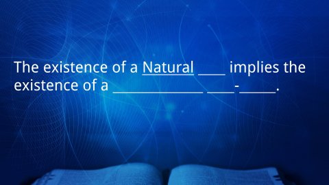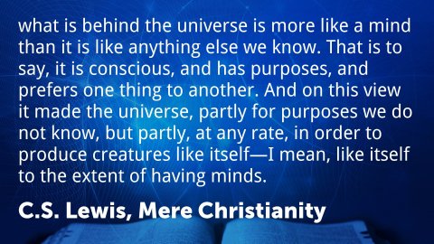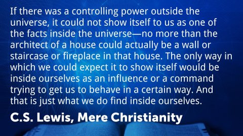 Lewis’ basic argument is that if this Natural Law was not created by us but is imposed upon us by an outside force or being, then this force or being that imposes Natural Law must itself not be natural. It must be above and beyond our natural powers of observation—it must be “supernatural.”The existence of a Natural Law implies the existence of a Supernatural Law-Giver.Mere Christianity 4. What Lies Behind the LawIf there was a controlling power outside the universe, it could not show itself to us as one of the facts inside the universe—no more than the architect of a house could actually be a wall or staircase or fireplace in that house. The only way in which we could expect it to show itself would be inside ourselves as an influence or a command trying to get us to behave in a certain way. And that is just what we do find inside ourselves.