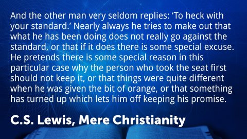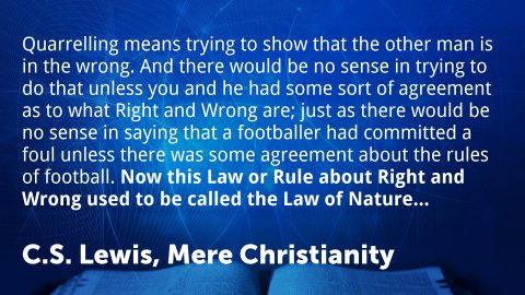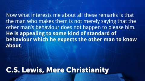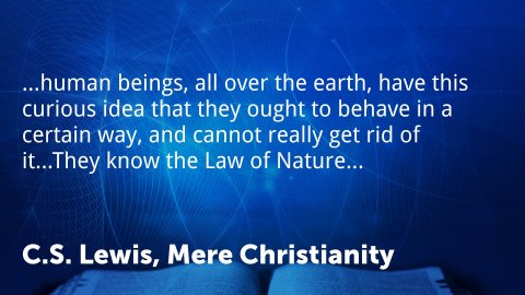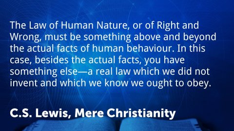 Mere Christianity 4. What Lies Behind the LawThe Law of Human Nature, or of Right and Wrong, must be something above and beyond the actual facts of human behaviour. In this case, besides the actual facts, you have something else—a real law which we did not invent and which we know we ought to obey.