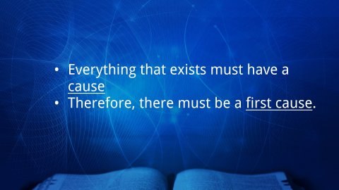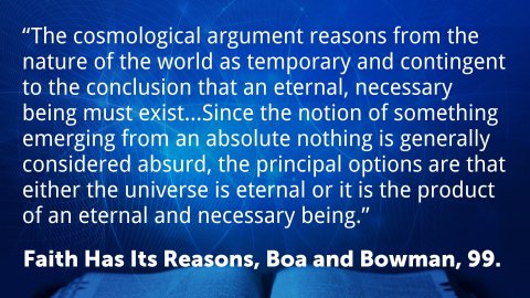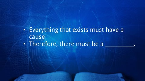 Cosmological ArgumentsFrom the Greek word kosmos, meaning ‘universe’“The cosmological argument reasons from the nature of the world as temporary and contingent to the conclusion that an eternal, necessary being must exist...Since the notion of something emerging from an absolute nothing is generally considered absurd, the principal options are that either the universe is eternal or it is the product of an eternal and necessary being.”Boa, Kenneth, and Robert M. Bowman Jr. Faith Has Its Reasons: Integrative Approaches to Defending the Christian Faith. Westmont, IL: IVP, 2012, 99.There cannot be an infinite regression of causes. Even if we accept that the universe in its current form began with the Big Bang, what caused the Big Bang?The only way out of that cycle of infinite regressions is to pose something or someone that is un-caused, un-created, eternal, and self-existing...which sounds a lot like God!Everything that exists must have a causeTherefore, there must be a first causeThomas Aquinas’ Cosmological Arguments:The “Unmoved Mover”—all things in motion need a mover, but there must be something unmoved that begins other things in motion.When we look at the planets and galaxies in motion, an obvious question arises—who set them in motion?The “Uncaused Cause”—all effects must have causes, but there cannot be an infinite series of causes into the past.Even if you accept naturalistic explanations for the origins of life on earth, there comes a point in the past where you can no longer offer a naturalistic explanation.Science is the study of the natural world through natural means of observation and experimentation. The law of conservation of mass states that matter cannot be created or destroyed in chemical reactions, only rearranged and transformed. This means all the matter that exists now has existed up until the point in which it came into being.We can describe the rearrangement and transformation of matter through time using science, but there is no way within the discipline of science to explain its creation. Something had to create matter.Imagine you were oil trapped inside of an engine. You could look around you and see the various components of the engine and perhaps even explain how they work and function together. But, even if you could perfectly explain every single function of that engine and vehicle from your internal perspective, you could never explain how that engine was turned on (let alone created!) merely by the explanations of the process you observe around you. You can trace back the chain of events to the turn of the key, but nothing within that system could tell you how that key got turned, or how that engine came into existence. For that, you have to look to something beyond the car and its internal processes.Argument from Contingency—all things exist in dependence on something else (contingent); therefore there must be something that is absolutely independent (necessary).Everything in the Universe is contingent. Nothing that exists in the universe had to exist. This points to someone or something that is necessary and must exist.This is very similar and related to the “uncaused cause” argumentArgument from Perfection—there appears to be an increasing degree of perfection among things; therefore there must be a being who is the height of perfection.Cosmological Arguments from ScripturePsalm 19:1–2 ESV 1 The heavens declare the glory of God, and the sky above proclaims his handiwork. 2 Day to day pours out speech, and night to night reveals knowledge.Romans 1:19–20 ESV 19 For what can be known about God is plain to them, because God has shown it to them. 20 For his invisible attributes, namely, his eternal power and divine nature, have been clearly perceived, ever since the creation of the world, in the things that have been made. So they are without excuse.We often think of Creation as the world outside of us, but we are also created beings and therefore part of Creation. Thus, our own consciences and hearts are part of God’s self-revelation.Ecclesiastes 3:11 ESV 11 He has made everything beautiful in its time. Also, he has put eternity into man’s heart, yet so that he cannot find out what God has done from the beginning to the end.John Calvin even argued that the existence of God is so inscribed upon the hearts of men that they cannot reasonably deny it.Institutes of the Christian Religion 1. The Character of This Natural EndowmentThere is within the human mind, and indeed by natural instinct, an awareness of divinity.