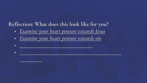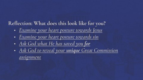 Reflection: What does this look like for you?Examine your heart posture towards JesusExamine your heart posture towards sinAsk God what He has saved you forAsk God to reveal your unique Great Commission assignmentActs 2:14–41 ESV 14 But Peter, standing with the eleven, lifted up his voice and addressed them: “Men of Judea and all who dwell in Jerusalem, let this be known to you, and give ear to my words. 15 For these people are not drunk, as you suppose, since it is only the third hour of the day. 16 But this is what was uttered through the prophet Joel: 17 “ ‘And in the last days it shall be, God declares, that I will pour out my Spirit on all flesh, and your sons and your daughters shall prophesy, and your young men shall see visions, and your old men shall dream dreams; 18 even on my male servants and female servants in those days I will pour out my Spirit, and they shall prophesy. 19 And I will show wonders in the heavens above and signs on the earth below, blood, and fire, and vapor of smoke; 20 the sun shall be turned to darkness and the moon to blood, before the day of the Lord comes, the great and magnificent day. 21 And it shall come to pass that everyone who calls upon the name of the Lord shall be saved.’ 22 “Men of Israel, hear these words: Jesus of Nazareth, a man attested to you by God with mighty works and wonders and signs that God did through him in your midst, as you yourselves know— 23 this Jesus, delivered up according to the definite plan and foreknowledge of God, you crucified and killed by the hands of lawless men. 24 God raised him up, loosing the pangs of death, because it was not possible for him to be held by it. 25 For David says concerning him, “ ‘I saw the Lord always before me, for he is at my right hand that I may not be shaken; 26 therefore my heart was glad, and my tongue rejoiced; my flesh also will dwell in hope. 27 For you will not abandon my soul to Hades, or let your Holy One see corruption. 28 You have made known to me the paths of life; you will make me full of gladness with your presence.’ 29 “Brothers, I may say to you with confidence about the patriarch David that he both died and was buried, and his tomb is with us to this day. 30 Being therefore a prophet, and knowing that God had sworn with an oath to him that he would set one of his descendants on his throne, 31 he foresaw and spoke about the resurrection of the Christ, that he was not abandoned to Hades, nor did his flesh see corruption. 32 This Jesus God raised up, and of that we all are witnesses. 33 Being therefore exalted at the right hand of God, and having received from the Father the promise of the Holy Spirit, he has poured out this that you yourselves are seeing and hearing. 34 For David did not ascend into the heavens, but he himself says, “ ‘The Lord said to my Lord, “Sit at my right hand, 35 until I make your enemies your footstool.” ’ 36 Let all the house of Israel therefore know for certain that God has made him both Lord and Christ, this Jesus whom you crucified.” 37 Now when they heard this they were cut to the heart, and said to Peter and the rest of the apostles, “Brothers, what shall we do?” 38 And Peter said to them, “Repent and be baptized every one of you in the name of Jesus Christ for the forgiveness of your sins, and you will receive the gift of the Holy Spirit. 39 For the promise is for you and for your children and for all who are far off, everyone whom the Lord our God calls to himself.” 40 And with many other words he bore witness and continued to exhort them, saying, “Save yourselves from this crooked generation.” 41 So those who received his word were baptized, and there were added that day about three thousand souls. Acts 2:12–13ESV