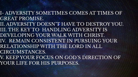 Genesis 37:1–11 NLT 1 So Jacob settled again in the land of Canaan, where his father had lived as a foreigner. 2 This is the account of Jacob and his family. When Joseph was seventeen years old, he often tended his father’s flocks. He worked for his half brothers, the sons of his father’s wives Bilhah and Zilpah. But Joseph reported to his father some of the bad things his brothers were doing. 3 Jacob loved Joseph more than any of his other children because Joseph had been born to him in his old age. So one day Jacob had a special gift made for Joseph—a beautiful robe. 4 But his brothers hated Joseph because their father loved him more than the rest of them. They couldn’t say a kind word to him. 5 One night Joseph had a dream, and when he told his brothers about it, they hated him more than ever. 6 “Listen to this dream,” he said. 7 “We were out in the field, tying up bundles of grain. Suddenly my bundle stood up, and your bundles all gathered around and bowed low before mine!” 8 His brothers responded, “So you think you will be our king, do you? Do you actually think you will reign over us?” And they hated him all the more because of his dreams and the way he talked about them. 9 Soon Joseph had another dream, and again he told his brothers about it. “Listen, I have had another dream,” he said. “The sun, moon, and eleven stars bowed low before me!” 10 This time he told the dream to his father as well as to his brothers, but his father scolded him. “What kind of dream is that?” he asked. “Will your mother and I and your brothers actually come and bow to the ground before you?” 11 But while his brothers were jealous of Joseph, his father wondered what the dreams meant.A- Joseph seemed to have all circumstances going his way. (Genesis 37:1-2)Genesis 37:1–2 NLT 1 So Jacob settled again in the land of Canaan, where his father had lived as a foreigner. 2 This is the account of Jacob and his family. When Joseph was seventeen years old, he often tended his father’s flocks. He worked for his half brothers, the sons of his father’s wives Bilhah and Zilpah. But Joseph reported to his father some of the bad things his brothers were doing.1- His family was settled in the land of promise.2- Joseph seemingly had his work-life in order.3- Joseph had the loving support of his father.B- Joseph began to experience adversity when everything else is going right. (Genesis 37:3-4)Genesis 37:3–4 NLT 3 Jacob loved Joseph more than any of his other children because Joseph had been born to him in his old age. So one day Jacob had a special gift made for Joseph—a beautiful robe. 4 But his brothers hated Joseph because their father loved him more than the rest of them. They couldn’t say a kind word to him.1- Joseph began to have problems even though he was doing right.C- Adversity came in-spite-of big dreams. (Genesis 37:5-11)Genesis 37:5–11 NLT 5 One night Joseph had a dream, and when he told his brothers about it, they hated him more than ever. 6 “Listen to this dream,” he said. 7 “We were out in the field, tying up bundles of grain. Suddenly my bundle stood up, and your bundles all gathered around and bowed low before mine!” 8 His brothers responded, “So you think you will be our king, do you? Do you actually think you will reign over us?” And they hated him all the more because of his dreams and the way he talked about them. 9 Soon Joseph had another dream, and again he told his brothers about it. “Listen, I have had another dream,” he said. “The sun, moon, and eleven stars bowed low before me!” 10 This time he told the dream to his father as well as to his brothers, but his father scolded him. “What kind of dream is that?” he asked. “Will your mother and I and your brothers actually come and bow to the ground before you?” 11 But while his brothers were jealous of Joseph, his father wondered what the dreams meant.Adversity comes because Satan wants to make us give up. (1 Pet 5:8–10)1 Peter 5:8–10 NLT 8 Stay alert! Watch out for your great enemy, the devil. He prowls around like a roaring lion, looking for someone to devour. 9 Stand firm against him, and be strong in your faith. Remember that your family of believers all over the world is going through the same kind of suffering you are. 10 In his kindness God called you to share in his eternal glory by means of Christ Jesus. So after you have suffered a little while, he will restore, support, and strengthen you, and he will place you on a firm foundation.Key Truth:Adversity often comes when when we are experiencing great blessing!II. ADVERSITY DOESN’T HAVE TO DESTROY YOU. (Genesis 39:1-3)Genesis 39:1–3 (NLT)1 When Joseph was taken to Egypt by the Ishmaelite traders, he was purchased by Potiphar, an Egyptian officer. Potiphar was captain of the guard for Pharaoh, the king of Egypt.2 The Lord was with Joseph, so he succeeded in everything he did as he served in the home of his Egyptian master.3 Potiphar noticed this and realized that the Lord was with Joseph, giving him success in everything he did.A- Joseph understood what it means to endure life’s hard knocks.Joseph was betrayed by his own family. (Genesis 37:24-28)Genesis 37:24–28 NLT 24 Then they grabbed him and threw him into the cistern. Now the cistern was empty; there was no water in it. 25 Then, just as they were sitting down to eat, they looked up and saw a caravan of camels in the distance coming toward them. It was a group of Ishmaelite traders taking a load of gum, balm, and aromatic resin from Gilead down to Egypt. 26 Judah said to his brothers, “What will we gain by killing our brother? We’d have to cover up the crime. 27 Instead of hurting him, let’s sell him to those Ishmaelite traders. After all, he is our brother—our own flesh and blood!” And his brothers agreed. 28 So when the Ishmaelites, who were Midianite traders, came by, Joseph’s brothers pulled him out of the cistern and sold him to th