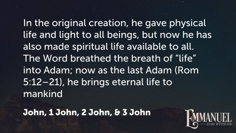 John 1:1–3 HCSB In the beginning was the Word, and the Word was with God, and the Word was God. He was with God in the beginning. All things were created through Him, and apart from Him not one thing was created that has been created.By recalling the opening words of the beginning account of God’s story from Genesis 1:1 we are reminded :a. God pre-exists His creation. Before there was anything, there was God. And the Word, whom we learn is Jesus, was with God - in the beginning. The first word of the Hebrew text of Genesis = beginning. The word has many uses in the OT. In the context of Genesis and John’s use of the phrase we are called to recognize that there is a specific point in time when God started His creative activity.b). The Word was ‘with’God and the ‘Word’ was God. The original language is clear. The Word, whom we know as Jesus - the One whose birth culminates our Advent celebrations - was not only present with God, He is God. All that can be said of Jesus can be said of God. All that can be said of God can be said of Jesus.c). All that exists is due to the activity of God - the Word - and as we learn in Genesis 1:2 the Spirit of God.The story God is writing with our lives begins at a specific point in time.The first creative act of God:Genesis 1:3 HCSB Then God said, “Let there be light,” and there was light.John points to God’s first act oof creation as being the very source of life. We know that life was we experience it could not exist apart from an external source of light.John is pointing to a significant truth easily missed:John, 1 John, 2 John, & 3 John The Essence of the Word (1:1–5)In the original creation, he gave physical life and light to all beings, but now he has also made spiritual life available to all. The Word breathed the breath of “life” into Adam; now as the last Adam (