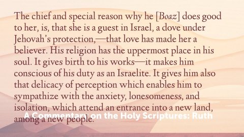 Ruth 2:1–13 ESV 1 Now Naomi had a relative of her husband’s, a worthy man of the clan of Elimelech, whose name was Boaz. 2 And Ruth the Moabite said to Naomi, “Let me go to the field and glean among the ears of grain after him in whose sight I shall find favor.” And she said to her, “Go, my daughter.” 3 So she set out and went and gleaned in the field after the reapers, and she happened to come to the part of the field belonging to Boaz, who was of the clan of Elimelech. 4 And behold, Boaz came from Bethlehem. And he said to the reapers, “The Lord be with you!” And they answered, “The Lord bless you.” 5 Then Boaz said to his young man who was in charge of the reapers, “Whose young woman is this?” 6 And the servant who was in charge of the reapers answered, “She is the young Moabite woman, who came back with Naomi from the country of Moab. 7 She said, ‘Please let me glean and gather among the sheaves after the reapers.’ So she came, and she has continued from early morning until now, except for a short rest.” 8 Then Boaz said to Ruth, “Now, listen, my daughter, do not go to glean in another field or leave this one, but keep close to my young women. 9 Let your eyes be on the field that they are reaping, and go after them. Have I not charged the young men not to touch you? And when you are thirsty, go to the vessels and drink what the young men have drawn.” 10 Then she fell on her face, bowing to the ground, and said to him, “Why have I found favor in your eyes, that you should take notice of me, since I am a foreigner?” 11 But Boaz answered her, “All that you have done for your mother-in-law since the death of your husband has been fully told to me, and how you left your father and mother and your native land and came to a people that you did not know before. 12 The Lord repay you for what you have done, and a full reward be given you by the Lord, the God of Israel, under whose wings you have come to take refuge!” 13 Then she said, “I have found favour in your eyes, my lord, for you have comforted me and spoken kindly to your servant, though I am not one of your servants.”IntroductionNaomi and Ruth have arrived in Bethlehem. Both of them would have been somewhat apprehensive. Naomi wondering how she would be received by those whom she knew in Bethlehem. For Ruth it was a totally new experience and she would have concerns as to how she, being a Moabite, would be treated. In both cases things worked out well.In our application that Naomi represents the backslidden Christian returning to the Lord and the Church. Ruth, the new convert, having a first experience of the Church.Let me be clear that I am not suggesting that this an allegory. It is a true historical event with real people in real situations dealing with real events. But there is a proper spiritual application that we must study.Slide1. A Kinsman v1SlideRuth 2:1 ESV 1 Now Naomi had a relative of her husband’s, a worthy man of the clan of Elimelech, whose name was Boaz.a. Relative of ElimelechRuth 2:1 ESV 1 Now Naomi had a relative of her husband’s, a worthy man of the clan of Elimelech, whose name was Boaz.b. A Worthy ManRuth 2:1 ESV 1 Now Naomi had a relative of her husband’s, a worthy man of the clan of Elimelech, whose name was Boaz.A valiant hero. These words are applied to Boaz in no other sense than to Gideon (Judg. 6:12), Jephthah (11:1), and others, and have no reference to his wealth and property. He was a strong and able man in Israel, in war and in peace. Probably he had distinguished himself in conflicts of Israel against enemies, perhaps against Moab.Judges 6:12 ESV 12 And the angel of the Lord appeared to him [Gideon] and said to him, “The Lord is with you, O mighty man of valour.”c. BoazMany have suggested that the etymology of Boaz is beʿōz, “in the strength of,” or bōʿōz, “in him (is) strength,” from the root ʿzz, “to be strong.” Noth, however, prefers “of sharp mind”Slide2. Ruth’s Commitment v2-3SlideRuth 2:2–3 ESV 2 And Ruth the Moabite said to Naomi, “Let me go to the field and glean among the ears of grain after him in whose sight I shall find favor.” And she said to her, “Go, my daughter.” 3 So she set out and went and gleaned in the field after the reapers, and she happened to come to the part of the field belonging to Boaz, who was of the clan of Elimelech.a. Gleaning v2Ruth 2:2 ESV 2 And Ruth the Moabite said to Naomi, “Let me go to the field and glean among the ears of grain after him in whose sight I shall find favor.” And she said to her, “Go, my daughter.”Naomi was manifestly in need. No one seemed to help her, nor had she the heart to ask. It is but too clear now that her lot would have been a dismal one, if at her return Ruth had not faithfully clung to her. But this young woman’s fidelity shows itself now also. As the barley-harvest is in progress, she offers to go to the field and ask for permission to glean. Lange, J. P., Schaff, P., Cassel, P., & Steenstra, P. H. (2008). A commentary on the Holy ScriptureGlean, Gleaning. Practice of allowing the poor to follow reapers in a field to pick up missed spears of grain (cf. Lv 19:9, 10; 23:22; Dt 24:21; Ru 2:2–23). Vineyards, as well as fields of grain, were to be available for gleaning.Leviticus 19:9–10 ESV 9 “When you reap the harvest of your land, you shall not reap your field right up to its edge, neither shall you gather the gleanings after your harvest. 10 And you shall not strip your vineyard bare, neither shall you gather the fallen grapes of your vineyard. You shall leave them for the poor and for the sojourner: I am the Lord your God.b . Faith and Hope v2Ruth 2:2 ESV 2 And Ruth the Moabite said to Naomi, “Let me go to the field and glean among the ears of grain after him in whose sight I shall find favor.” And she said to her, “Go, my daughter.”It was no easy offer. Ruth was probably ignorant of those provisions of the Israelitish 