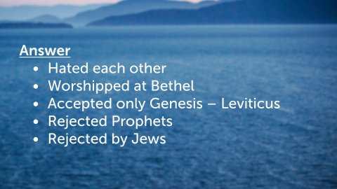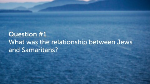 John 4:1–6 ESV Now when Jesus learned that the Pharisees had heard that Jesus was making and baptizing more disciples than John (although Jesus himself did not baptize, but only his disciples), he left Judea and departed again for Galilee. And he had to pass through Samaria. So he came to a town of Samaria called Sychar, near the field that Jacob had given to his son Joseph. Jacob’s well was there; so Jesus, wearied as he was from his journey, was sitting beside the well. It was about the sixth hour.Question #1What was the relationship between Jews and Samaritans?AnswerHated each otherWorshipped at BethelAccepted only Genesis – LeviticusRejected ProphetsRejected by JewsLuke 9:51–56 ESV When the days drew near for him to be taken up, he set his face to go to Jerusalem. And he sent messengers ahead of him, who went and entered a village of the Samaritans, to make preparations for him. But the people did not receive him, because his face was set toward Jerusalem. And when his disciples James and John saw it, they said, “Lord, do you want us to tell fire to come down from heaven and consume them?” But he turned and rebuked them. And they went on to another village.John 4:7–9 ESV A woman from Samaria came to draw water. Jesus said to her, “Give me a drink.” (For his disciples had gone away into the city to buy food.) The Samaritan woman said to him, “How is it that you, a Jew, ask for a drink from me, a woman of Samaria?” (For Jews have no dealings with Samaritans.)Question #2Why was the Samaritan woman surprised by Jesus talking with her (vs. 9)?John 4:10 ESV Jesus answered her, “If you knew the gift of God, and who it is that is saying to you, ‘Give me a drink,’ you would have asked him, and he would have given you living water.”John 4:11–14 ESV The woman said to him, “Sir, you have nothing to draw water with, and the well is deep. Where do you get that living water? Are you greater than our father Jacob? He gave us the well and drank from it himself, as did his sons and his livestock.” Jesus said to her, “Everyone who drinks of this water will be thirsty again, but whoever drinks of the water that I will give him will never be thirsty again. The water that I will give him will become in him a spring of water welling up to eternal life.”Knowing Jesus = Knowing Truth = Obtaining Living WaterNatural water satisfies temporarily, it is earthly, natural, and temporal.Living water satisfies completely and without end.Whoever drinks natural water will eventually die, it only keeps him alive for so long. Whoever drinks the spiritual living water will never die.Jesus is the Living Water We drink Him in by believing and obeying His Word.John 4:15–24 ESV The woman said to him, “Sir, give me this water, so that I will not be thirsty or have to come here to draw water.” Jesus said to her, “Go, call your husband, and come here.” The woman answered him, “I have no husband.” Jesus said to her, “You are right in saying, ‘I have no husband’; for you have had five husbands, and the one you now have is not your husband. What you have said is true.” The woman said to him, “Sir, I perceive that you are a prophet. Our fathers worshiped on this mountain, but you say that in Jerusalem is the place where people ought to worship.” Jesus said to her, “Woman, believe me, the hour is coming when neither on this mountain nor in Jerusalem will you worship the Father. You worship what you do not know; we worship what we know, for salvation is from the Jews. But the hour is coming, and is now here, when the true worshipers will worship the Father in spirit and truth, for the Father is seeking such people to worship him. God is spirit, and those who worship him must worship in spirit and truth.”Question #3What was Jesus’ method in witnessing to the Samaritan woman?AnswerContact - He found a way to enter into the conversation by asking for waterChallenge - Jesus seized on the opportunity to talk to her about the "living" water.Confirmation - Demonstrating the proof of what he was talking aboutConversation - He conveyed the good newsQuestion #4Explain John 4:24Answer John 4:1–6LEB