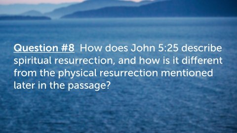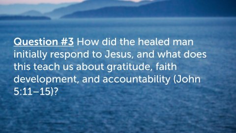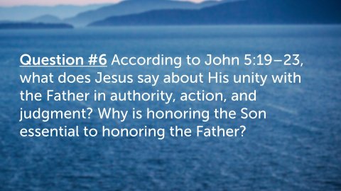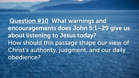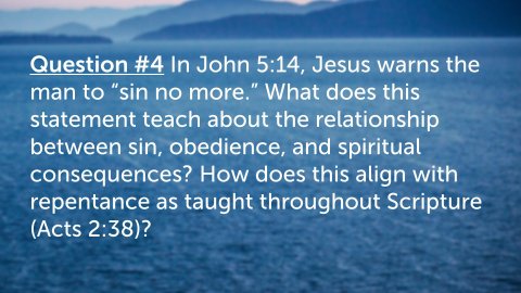 John 5:1–9 ESV After this there was a feast of the Jews, and Jesus went up to Jerusalem. Now there is in Jerusalem by the Sheep Gate a pool, in Aramaic called Bethesda, which has five roofed colonnades. In these lay a multitude of invalids—blind, lame, and paralyzed. One man was there who had been an invalid for thirty-eight years. When Jesus saw him lying there and knew that he had already been there a long time, he said to him, “Do you want to be healed?” The sick man answered him, “Sir, I have no one to put me into the pool when the water is stirred up, and while I am going another steps down before me.” Jesus said to him, “Get up, take up your bed, and walk.” And at once the man was healed, and he took up his bed and walked. Now that day was the Sabbath.A place of human suffering and needA popular belief in healing through the waterQuestion #1 What does Jesus’ question in John 5:6 (“Do you want to be healed?”) reveal about personal responsibility in responding to God’s grace? How does this challenge the idea that people are healed or saved without willingness or response?Question #2 Why do you think Jesus chose to heal this man on the Sabbath (John 5:8–9), and what does this reveal about Jesus’ authority? How does this event expose misunderstandings about the purpose of God’s law?John 5:10–15 ESV So the Jews said to the man who had been healed, “It is the Sabbath, and it is not lawful for you to take up your bed.” But he answered them, “The man who healed me, that man said to me, ‘Take up your bed, and walk.’ ” They asked him, “Who is the man who said to you, ‘Take up your bed and walk’?” Now the man who had been healed did not know who it was, for Jesus had withdrawn, as there was a crowd in the place. Afterward Jesus found him in the temple and said to him, “See, you are well! Sin no more, that nothing worse may happen to you.” The man went away and told the Jews that it was Jesus who had healed him.Question #3 How did the healed man initially respond to Jesus, and what does this teach us about gratitude, faith development, and accountability (John 5:11–15)?Question #4 In John 5:14, Jesus warns the man to “sin no more.” What does this statement teach about the relationship between sin, obedience, and spiritual consequences? How does this align with repentance as taught throughout Scripture (Acts 2:38)?John 5:16–18 ESV And this was why the Jews were persecuting Jesus, because he was doing these things on the Sabbath. But Jesus answered them, “My Father is working until now, and I am working.” This was why the Jews were seeking all the more to kill him, because not only was he breaking the Sabbath, but he was even calling God his own Father, making himself equal with God.Question #5 What claim is Jesus making in John 5:17–18 about His relationship with the Father, and why did this anger the Jewish leaders? Why is this passage critical for understanding the deity of Christ?John 5:19–23 ESV So Jesus said to them, “Truly, truly, I say to you, the Son can do nothing of his own accord, but only what he sees the Father doing. For whatever the Father does, that the Son does likewise. For the Father loves the Son and shows him all that he himself is doing. And greater works than these will he show him, so that you may marvel. For as the Father raises the dead and gives them life, so also the Son gives life to whom he will. For the Father judges no one, but has given all judgment to the Son, that all may honor the Son, just as they honor the Father. Whoever does not honor the Son does not honor the Father who sent him.Question #6 According to John 5:19–23, what does Jesus say about His unity with the Father in authority, action, and judgment? Why is honoring the Son essential to honoring the Father?John 5:24 ESV Truly, truly, I say to you, whoever hears my word and believes him who sent me has eternal life. He does not come into judgment, but has passed from death to life.Question #7 What does Jesus mean in John 5:24 when He says that those who hear and believe have “passed from death into life”? How does this verse harmonize belief with obedience rather than belief alone?John 5:25 ESV “Truly, truly, I say to you, an hour is coming, and is now here, when the dead will hear the voice of the Son of God, and those who hear will live.Question #8 How does John 5:25 describe spiritual resurrection, and how is it different from the physical resurrection mentioned later in the passage?John 5:28–29 ESV Do not marvel at this, for an hour is coming when all who are in the tombs will hear his voice and come out, those who have done good to the resurrection of life, and those who have done evil to the resurrection of judgment.Question #9 In John 5:28–29, Jesus speaks of a universal resurrection. What are the two outcomes He describes, and what determines each one?Question #10 What warnings and encouragements does John 5:1–29 give us about listening to Jesus today? How should this passage shape our view of Christ’s authority, judgment, and our daily obedience?John 5:16–18NKJV
