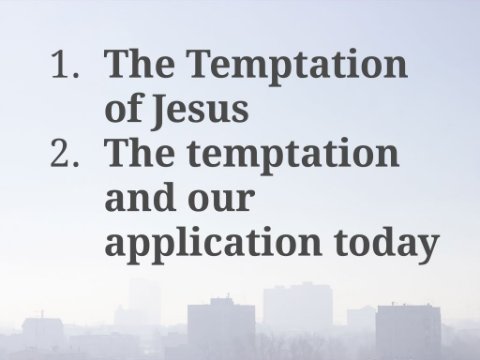 Mark 1:9–10 NASB95 9 In those days Jesus came from Nazareth in Galilee and was baptized by John in the Jordan. 10 Immediately coming up out of the water, He saw the heavens opening, and the Spirit like a dove descending upon Him;Mark 1:11 NASB95 11 and a voice came out of the heavens: “You are My beloved Son, in You I am well-pleased.”and then comes the ministryMark 1:14–15 NASB95 14 Now after John had been taken into custody, Jesus came into Galilee, preaching the gospel of God, 15 and saying, “The time is fulfilled, and the kingdom of God is at hand; repent and believe in the gospel.”Mark is abbreviated in his version compared to Mt(4:1-11) and Luke (4:1-13).Mark gives some details that the others do not, as they give many details Mark does not, so we will look at some of each today as we look at the temptation and triumph of Jesus here in our passage.Even though it is abbreviated we can learn much because of the temptations Jesus faced.Blessings we can know from His temptations:Able to come to the aid of the people (Heb2:18)Hebrews 2:18 NASB95 18 For since He Himself was tempted in that which He has suffered, He is able to come to the aid of those who are tempted.Heb2:18Able to be sympathetic and give mercy and grace (Heb4:14-16)Hebrews 4:14–15 NASB95 14 Therefore, since we have a great high priest who has passed through the heavens, Jesus the Son of God, let us hold fast our confession. 15 For we do not have a high priest who cannot sympathize with our weaknesses, but One who has been tempted in all things as we are, yet without sin.Hebrews 4:16 NASB95 16 Therefore let us draw near with confidence to the throne of grace, so that we may receive mercy and find grace to help in time of need.It reminds us that Jesus can understand our temptationsIt reveals to us that we too can have victory in overcoming temptation.Having these things in mind now we can look at the passage with two points to look at today.The Temptation of JesusThe temptation and our application todayI. The Temptation of JesusAs we look at the temptation we will look at the setting, the climax and the end of it.Mark 1:12 NASB95 12 Immediately the Spirit impelled Him to go out into the wilderness.Mark 1:12–13 NKJV 12 Immediately the Spirit drove Him into the wilderness. 13 And He was there in the wilderness forty days, tempted by Satan, and was with the wild beasts; and the angels ministered to Him.What do you see, what do you notice, what sticks out to you?The setting we can see that the Spirit initiated this (v.12)Just as the Spirit came upon Him like a dove (v.10)Mark 1:10 NASB95 10 Immediately coming up out of the water, He saw the heavens opening, and the Spirit like a dove descending upon Him;We don’t know exactly what wilderness, it does not say, but we may assume since he is in Judea that it is there.We can know that he was there for 40 days (v.13)From Mt4:1-2 we can know he fasted like MosesMatthew 4:1–2 NASB95 1 Then Jesus was led up by the Spirit into the wilderness to be tempted by the devil. 2 And after He had fasted forty days and forty nights, He then became hungry.Here is the Moses passageExodus 34:28 NASB95 28 So he was there with the Lord forty days and forty nights; he did not eat bread or drink water. And he wrote on the tablets the words of the covenant, the Ten Commandments.We can know He was tempted by Satan (v.12)Satan: AdversaryMatthew and Luke use “devil:” accuser, slandererInteresting fact, only Mark makes mention of wild beasts (v.13) - beasts common in the wilderness of Judea, lions, tigers and bears, oh my. no hold on it is really lions, panthers, hyenas and jackals.So the setting is wilderness where Jesus is in desolation, deprivation and temptation.The climaxMark gives little detail except angels ministered to Him (v.13)Matthew and Luke give more information; we will look at Mt4:3-10)Matthew 4:3–4 NASB95 3 And the tempter came and said to Him, “If You are the Son of God, command that these stones become bread.” 4 But He answered and said, “It is written, ‘Man shall not live on bread alone, but on every word that proceeds out of the mouth of God.’ ”We can see the appeal to lust of the flesh (vv.3-4)Matthew 4:5–6 NASB95 5 Then the devil took Him into the holy city and had Him stand on the pinnacle of the temple, 6 and said to Him, “If You are the Son of God, throw Yourself down; for it is written, ‘He will command His angels concerning You’; and ‘On their hands they will bear You up, So that You will not strike Your foot against a stone.’ ”Mt4:3-4We can see the appeal to the pride of life (vv.5-7)Matthew 4:7–8 NASB95 7 Jesus said to him, “On the other hand, it is written, ‘You shall not put the Lord your God to the test.’ ” 8 Again, the devil took Him to a very high mountain and showed Him all the kingdoms of the world and their glory;We can see the appeal to the lust of the eyes (vv.8-10)Matthew 4:9–10 NASB95 9 and he said to Him, “All these things I will give You, if You fall down and worship me.” 10 Then Jesus said to him, “Go, Satan! For it is written, ‘You shall worship the Lord your God, and serve Him only.’ ”As Jesus responded to each temptation we too can do the same, with the word of God. Jesus said “it is written” (vv.4, 7 and 10).The end of the temptationWe can know angels ministered to Him (v.13)exactly how they ministered we do not know, it is not stateIn looking at (Lk4:13) we can know that this is not the last time Satan would tempt JesusLuke 4:13 NASB95 13 When the devil had finished every temptation, he left Him until an opportune time.This is not the last time angels ministered to Jesus either (Lk22:43)Luke 22:43 NASB95 43 Now an angel from heaven appeared to Him, strengthening Him.So after 40 days of temptation, Jesus is ready to start, begin His ministry work. Sometimes we may have times of trials, tribulations, even temptations that are in preparation for ministry work we are to do.II. Temptat