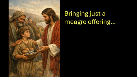 - A problem too bigWe’ve been saying it for years now, but there is a cost of living crisis in Australia, and while opposition parties in parliament always think they have the solution the problem seems very persistent.As a result, their our countless people throughout our community who are doing it tough. We also have a housing crisis meaning there are many people living in sub-par houses, or more and more frequently, no house at all.As a church, we want to help. At Christmas time we had the opportunity to donate into the Christmas hampers. As they were handed out, they were really well received.Now it’s not my intention to diminish this effort at all, but while it was a lovely gesture, when you think about it, it doesn’t really change the situation. You see, they enjoy a few nice things they didn’t have to pay for for a while, but that runs out, and they’re back to where they were.Are we really making a difference?It’s often the case when we help people out. It’s appreciated in the moment, but not much real change.Now we could rationalise it by assuming if enough people help, then a real difference could be made. But will enough people actually help?Or we could hope that maybe the help we provide will just be the leg up that they need to get them out of the hole they’ve found themselves in - but is that hope realistic?Well, I’m going to suggest that the meagre amount we can offer is worth it… not because of the reasons I just mentioned (even if there might be some truth to them), but because we have a God who can turn our little into something significant.You might not be able to make a significant difference in the world around us - but guess what? We know someone who can.The gathering crowdWell, today we venture back into John’s gospel which is actually where we started this series, having first looked at Jesus turning water into wine in John 2.Now here in chapter 6, the setting is the Sea of Galilee. Well, as I mentioned last week, Jesus has stationed himself in the town of Capernaum which is on the Northern side of the lake. We’re told at the start of chapter 6 that Jesus crosses over to the far shore, but by this point in his ministry, people are constantly trying to seek him out.Verse 2 tells us that they followed him, so maybe some went via boat, and some went around on dry land.Well, when Jesus arrived at the other side, he wanted to take the opportunity to talk with his disciples, so he goes up a mountain side (or possibly more accurately, a hillside), and he sits down to teach them.But then verse 5 tells us he looks up, and there is a huge crowd coming toward him.Now, when it says “massive crowd” it’s not exaggerating. We’re told later in verse 10 that there were about five thousand men, and as Matthew’s gospel makes clear, this is the number besides women and children, so the number would have been even bigger.To put that in perspective, the population here on the Tilligerry Peninsula is a little under seven thousand people.So imagine we all decide to go for a walk down to (say) Salt Ash but then the entire Tilligerry Peninsula say, I wonder what they’re doing, let’s go walk down after them and find out, and all seven thousand of them start walking down.Now imagine, we’re sitting in our little group having a lovely conversation and we look up and just see the most massive group walking down the line.But then imagine, someone in our group pipes up and says: ‘you know what would be nice? Given these people have walked so far, I reckon we should give them each some lunch’.I think we all turn to the person who made the comment, and I suspect we just laugh at them.I know some people are very good at producing food on short notice when someone turns up at their house, but when you’re far from home, and we’re talking thousands and thousands of people… it’s a completely different league. It can’t be done it’s impossible.A testing questionWell, this is exactly what happens as Jesus sits on a hilltop with his disciples - only it’s Jesus who says to his disciples - let’s give them lunch!Well, actually, they weren’t his exact words.Rather it’s initially a question directed at Philip, and it’s almost as if he’s testing his skills in logistics.The question he asks is this: “Where shall we buy bread for these people to eat?”Now, I reckon you would have been able to see the cogs turn in Philip’s head. He’s looking up and starting to do some mental arithemtic.People are just streaming to the location and he’s trying his hardest to make an estimate of the number of people. I’m thinking in the end he just thinks - this question is ridiculous. Even if a shop magically appeared in front of them and somehow had enough bread, there’s not a chance inn the world that they would have anywhere near enough money. I suspect his just randomly throwing a number out there when he says it would take more than half a year’s wages just so everyone could have a bite. But perhaps his not too far off the mark.Loaves and fishesAnother of the disciples, Andrew, joins the conversaiton. Now, have you ever been in one of those brain storming sessions, where you run out of sensible ideas pretty quick, and so you just throw out some pretty wild ideas that you know have not a chance of solving the problem. Well, I think Andrew’s up to throwing out the wild ideas.You see, he’s spotted a boy who’s carried with himself five small barkley loaves and two small fish. Now these barley loaves are about as basic as things get. And the fish would have likely been some sort of pickled fish (I’m think something like a sardine), that you would be able to add to the bread to give it a little flavour.So, yes, Andrew brings this very meagre amount of food to the attention of Jesus, but he knows how ridiculous it sounds. Everyone would only get the smallest grain of bread.But Jesus is like: is that your offering… okay, I can work with that.The 
