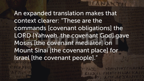 Leviticus 27:34 NLT These are the commands that the Lord gave through Moses on Mount Sinai for the Israelites.Holman Bible Handbook LeviticusAn expanded translation makes that context clearer: “These are the commands [covenant obligations] the LORD [Yahweh, the covenant God] gave Moses [the covenant mediator] on Mount Sinai [the covenant place] for Israel [the covenant people].”