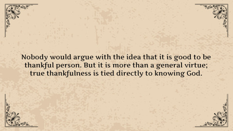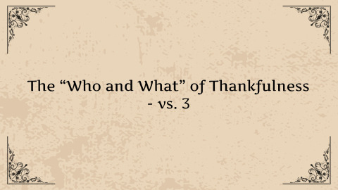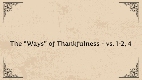 Psalm 95:3 ESV For the Lord is a great God, and a great King above all gods.Psalm 96:10 ESV Say among the nations, “The Lord reigns! Yes, the world is established; it shall never be moved; he will judge the peoples with equity.”Psalm 97:1 ESV The Lord reigns, let the earth rejoice; let the many coastlands be glad!Psalm 98:8–9 ESV Let the rivers clap their hands; let the hills sing for joy together before the Lord, for he comes to judge the earth. He will judge the world with righteousness, and the peoples with equity.Psalm 99:4–5 ESV The King in his might loves justice. You have established equity; you have executed justice and righteousness in Jacob. Exalt the Lord our God; worship at his footstool! Holy is he!Psalm 100 is an invitation for the world to see and know and rejoice that there is a Great, eternal, faithful, just, righteous King who sits on his throne forever.And, it shows the heart response of those who do see and know that - thankfulness.Gratitude.Nobody would argue with the idea that it is good to be thankful person. But it is more than a general virtue; true thankfulness is tied directly to knowing God.The “Who and What” of Thankfulness - vs. 3Knowing the “who” teaches us the “what”Psalm 100:3 ESV Know that the Lord, he is God! It is he who made us, and we are his; we are his people, and the sheep of his pasture.Yahweh is God - The creator, over all.It is a fact we can know, but more than that, He is one whom we can know.John 17:1–2 ESV When Jesus had spoken these words, he lifted up his eyes to heaven, and said, “Father, the hour has come; glorify your Son that the Son may glorify you, since you have given him authority over all flesh, to give eternal life to all whom you have given him.John 17:3 ESV And this is eternal life, that they know you, the only true God, and Jesus Christ whom you have sent.What does it mean to know someone?not a “name drop”If you called them, would they answer?If we find no reason to be thankful, do we know God, are we his? Because God’s children, God’s sheep, always have reason for thankfulness in their shepherd, in their father.Hearing about someone, or being loosely acquainted with someone, is much different than knowing them.The same is true with God - knowing about Him, even loosely agreeing with the idea that He exists, is different than calling out to Him.Have you called out to Him?What is your relationship with God right now?I believe in himI Think he’s realI think he’s importantThat is different than sayingI spoke with him this morningI call out to Him all the timeI love Him because he loves and has forgiven me of all my sinI depend on Him daily for my strengthI look to Him for answers for life’s questionsI trust in him to the very core of my beingThe “Ways” of Thankfulness - vs. 1-2, 4SingingPsalm 100:1 ESV Make a joyful noise to the Lord, all the earth!What is inside comes out.Colossians 3:15–17 ESV And let the peace of Christ rule in your hearts, to which indeed you were called in one body. And be thankful. Let the word of Christ dwell in you richly, teaching and admonishing one another in all wisdom, singing psalms and hymns and spiritual songs, with thankfulness in your hearts to God. And whatever you do, in word or deed, do everything in the name of the Lord Jesus, giving thanks to God the Father through him.ServingPsalm 100:2 ESV Serve the Lord with gladness! Come into his presence with singing!Basic meaning - to till the ground.SavoringPsalm 100:4 ESV Enter his gates with thanksgiving, and his courts with praise! Give thanks to him; bless his name!in the Old Testament System, there were specific sacrifices. Those sacrifices said “thank you,” but they also showed that the one being thanked was worth something.Romans 12:1 ESV I appeal to you therefore, brothers, by the mercies of God, to present your bodies as a living sacrifice, holy and acceptable to God, which is your spiritual worship.The “Why” of Thankfulness - vs. 5Psalm 100:5 ESV For the Lord is good; his steadfast love endures forever, and his faithfulness to all generations.Psalm 93:1 ESV The Lord reigns; he is robed in majesty; the Lord is robed; he has put on strength as his belt. Yes, the world is established; it shall never be moved.Deuteronomy 32:4 ESV “The Rock, his work is perfect, for all his ways are justice. A God of faithfulness and without iniquity, just and upright is he.Psalm 18:30 ESV This God—his way is perfect; the word of the Lord proves true; he is a shield for all those who take refuge in him.Jeremiah 32:17 ESV ‘Ah, Lord God! It is you who have made the heavens and the earth by your great power and by your outstretched arm! Nothing is too hard for you.Isaiah 6:3 ESV And one called to another and said: “Holy, holy, holy is the Lord of hosts; the whole earth is full of his glory!”Exodus 34:6 ESV The Lord passed before him and proclaimed, “The Lord, the Lord, a God merciful and gracious, slow to anger, and abounding in steadfast love and faithfulness,Psalm 147:1 ESV Praise the Lord! For it is good to sing praises to our God; for it is pleasant, and a song of praise is fitting.Psalm 147:3 ESV He heals the brokenhearted and binds up their wounds.John 17:3 ESV And this is eternal life, that they know you, the only true God, and Jesus Christ whom you have sent.John 3:16 ESV “For God so loved the world, that he gave his only Son, that whoever believes in him should not perish but have eternal life.1 Peter 1:3 ESV Blessed be the God and Father of our Lord Jesus Christ! According to his great mercy, he has caused us to be born again to a living hope through the resurrection of Jesus Christ from the dead, Psalm 95:3NASB95