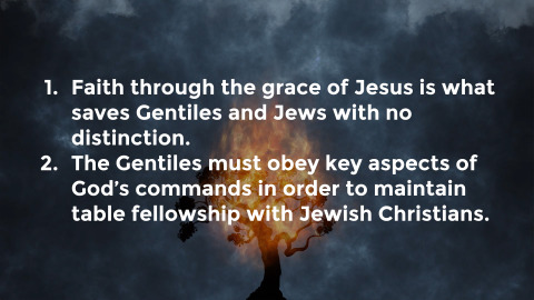 Acts 15:1–2 NLT 1 While Paul and Barnabas were at Antioch of Syria, some men from Judea arrived and began to teach the believers: “Unless you are circumcised as required by the law of Moses, you cannot be saved.” 2 Paul and Barnabas disagreed with them, arguing vehemently. Finally, the church decided to send Paul and Barnabas to Jerusalem, accompanied by some local believers, to talk to the apostles and elders about this question.We now have an official church dispute! They are getting the big dogs involved! I am making light of this event, but in reality it was an important and pivotal moment for the early church about a much more serious and theological disagreement than “Who’s bringing the mashed potatoes?” It comes down to understanding the first century Jewish mindset. According to Nate Sala…In this first century mindset, there were three distinctions or aspects to God’s law:Cultic LawEthical LawMiqsat Ma’ase ha-Torah (“Some of the Works of the Law”)Cultic laws are ritual laws, or the procedures needed to maintain holiness and proper worship in Israel’s relationship with God.Ethical laws are the moral commands that reflect God’s character in everyday life.The last are the works of the law, or a selection of commandments that mark or define those who truly belong to God’s covenant people. It’s not the entire law, but select boundary markers, like circumcision, Sabbath observance, dietary laws, and purity rules.Some of the Jewish believers struggled to understand how Gentiles could become Christians if they didn’t adhere to these boundary laws. So Paul and Barnabas go to the church in Jerusalem to meet with the apostles and elders to settle the matter. As they debate this issue, Peter finally stands and addresses the council. We read this passage a few weeks ago when we read about Peter first witnessing the Gentiles receive the Holy Spirit…Acts 15:7–11 NIV 7 After much discussion, Peter got up and addressed them: “Brothers, you know that some time ago God made a choice among you that the Gentiles might hear from my lips the message of the gospel and believe. 8 God, who knows the heart, showed that he accepted them by giving the Holy Spirit to them, just as he did to us. 9 He did not discriminate between us and them, for he purified their hearts by faith. 10 Now then, why do you try to test God by putting on the necks of Gentiles a yoke that neither we nor our ancestors have been able to bear? 11 No! We believe it is through the grace of our Lord Jesus that we are saved, just as they are.”Paul and Barnabas also spoke about the signs and wonders that God had done among the Gentiles. James also spoke and quoted from the Old Testament to show how this was a fulfilment of prophesy. In the end, the council determined two things…Faith through the grace of Jesus is what saves Gentiles and Jews with no distinction.The Gentiles must obey key aspects of God’s commands in order to maintain table fellowship with Jewish Christians.What does that mean? Most importantly, it means that they realized that the only thing that saves a person is faith in Jesus Christ. Nothing else could bring someone into a right relationship with God. Paul once said this to Peter when he was falling into this same religious trap…Galatians 2:15–21 NLT 15 “You and I are Jews by birth, not ‘sinners’ like the Gentiles. 16 Yet we know that a person is made right with God by faith in Jesus Christ, not by obeying the law. And we have believed in Christ Jesus, so that we might be made right with God because of our faith in Christ, not because we have obeyed the law. For no one will ever be made right with God by obeying the law.” 17 But suppose we seek to be made right with God through faith in Christ and then we are found guilty because we have abandoned the law. Would that mean Christ has led us into sin? Absolutely not! 18 Rather, I am a sinner if I rebuild the old system of law I already tore down. 19 For when I tried to keep the law, it condemned me. So I died to the law—I stopped trying to meet all its requirements—so that I might live for God. 20 My old self has been crucified with Christ. It is no longer I who live, but Christ lives in me. So I live in this earthly body by trusting in the Son of God, who loved me and gave himself for me. 21 I do not treat the grace of God as meaningless. For if keeping the law could make us right with God, then there was no need for Christ to die.It is only faith in Jesus that saves. So what about the second part? Why did they decide the Gentiles still had to obey key aspects of God’s commands? I think Paul would call it an act of love. Let me explain what I mean. This was a decision based on fellowship. Put yourself in the shoes of a first century Jewish Christian. Your whole life you have followed the law to the best of your ability. You love God and you have studied His nature. You are probably very familiar with what He does and doesn’t like. Because you love Him, you want to put your best foot forward. You want your life to reflect your love for Him. Even though you know that you are sanctified through Jesus, you still want to be pure. You don’t feel close to Him otherwise. Maybe there is even some residual law in your mind that tries to convince you that you might not actually be clean.One day you are sitting in church, doing all of your regular worship and purification rituals. You sit down and then a man you’ve never seen before walks in. He tells you how he heard the Good News this week and now he is a Christian. He gives you a great big hug and then walks off. As he leaves you say, “Maybe we’ll run into each other this week!” To which he responds, “That would be great! Come by my job. I am a butcher down at the pig farm.”Maybe you are a part of a small bible study and a similar situation happens. Someone new joins and while you are all eating supper you learn more about him and realize that you are ri