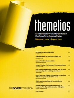 Themelios is an international evangelical theological journal that expounds and defends the historic Christian faith. Its primary audience is theological students and pastors, though scholars read it as well. It was formerly a print journal operated by RTSF/UCCF in the United Kingdom, and it became a digital journal operated by The Gospel Coalition in 2008. The new editorial team, led by D.A. Carson, seeks to preserve representation, in both essayists and reviewers, from both sides of the Atlantic. Each issue contains articles on important theological themes, as well as book reviews and discussion from the most important evangelical voices of our time.