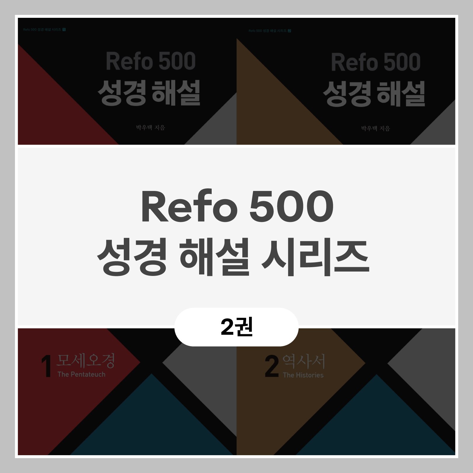 『Refo 500 성경 해설 시리즈』는 모세오경, 역사서, 시가서, 선지서, 복음서와 사도행전, 서신서와 요한계시록 등 총 6권으로 출간된다. 이 책은 성경의 핵심 주제인 구속사와 하나님 나라의 관점으로, 성경 저자들이 전달하고자 했던 방법인 문학적 특징과 문맥의 흐름을 따라 이해할 수 있도록 쓴 성경 해설서이며, 개혁 신학의 핵심을 담고 있는 교리 표준인 웨스트민스터 표준 문서에 따라 중요 교리를 설명하고 있기 때문에 역사적이고 전통적인 성경 해설의 정통성을 잘 담고 있다.
